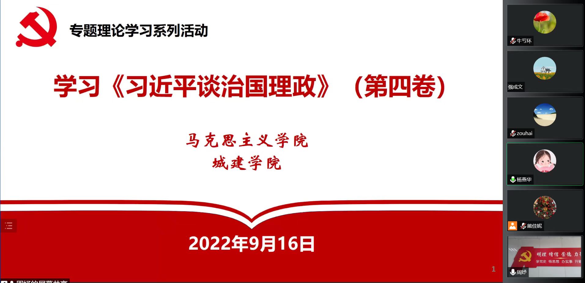 为深入学习贯彻落实习近平新时代中国特色社会主义思想,以实际行动迎接党的二十大胜利召开,916日,马克思主义学院和城建学院以线上线下相结合的方式联组举行专题理论学习。马克思主义学院周妤教授做《学深悟透< 习近平谈治国理政>第四卷》专题宣讲,马克思主义学院全体教师、城建学院党员教师、“知行学社”骨干成员参加了此次活动。会议由马克思主义学院直属党支部书记杨燕华主持。