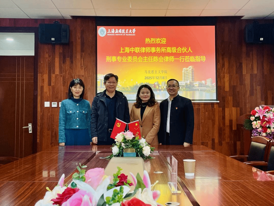 2025年12月8日上午上海中联律师事务所高级合伙人、刑事专业委员会主任陈会律师一行访问上海应用技术大学马克思主义学院、马克思主义研究院。陈会律师为师生作了“新时代法治逐梦:习近平法治思想学习”专题讲座。