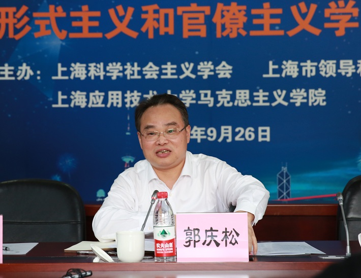 郭庆松对与会专家与嘉宾表示欢迎,介绍了学校发展历程、课程思政建设情况。他说,中国特色社会主义制度最根本的特征就是坚持党的领导,坚持党的领导首要的就是要抓好党的政治生态建设,党的政治生态建设必须力戒形式主义和官僚主义。结合市委巡视整改问题中强调的反对形式主义、官僚主义的重要性和现实紧迫性,他表示,与会专家学者共同深入学习习近平总书记关于形式主义、官僚主义论述,交流研讨新时代全面从严治党与中国之治的主题,意义重大。