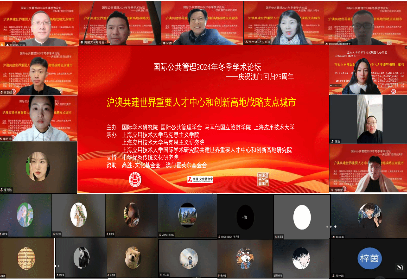 日前,由国际学术研究院、国际公共管理学会、马耳他国立旅游学院、上海应用技术大学主办,上海应用技术大学马克思主义学院、马克思主义研究院、上海应用技术大学—国际学术研究院共建世界重要人才中心和创新高地研究院承办,上海应用技术大学中华优秀传统文化研究院、学研出版社、《经济管理学刊》支持,国家外国专家项目基金、澳门霍英东基金会、高胜・文化基金会资助的国际公共管理2024冬季学术论坛圆满落幕。此次论坛为庆祝澳门回归25周年专场,主题为“沪澳共建世界重要人才中心和创新高地战略支点城市”,多名专家、学者、研究员参与,会议连续两天采用线上线下相结合方式进行,研究成果将助力世界重要人才中心与创新高地高质量发展。