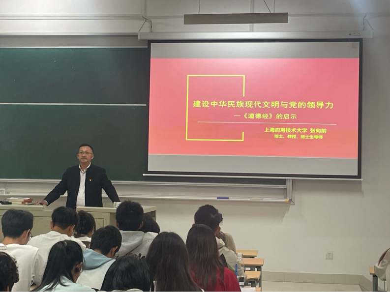 近日,上海应用技术大学马克思主义学院面向全体本科生,首开《习近平文化思想专论》系列课程,在校园内引起热烈反响。10月9日,马克思主义学院院长张向前教授以《建设中华民族现代文明与党的领导力》为题,开启《习近平文化思想专论》系列课程第一讲。
