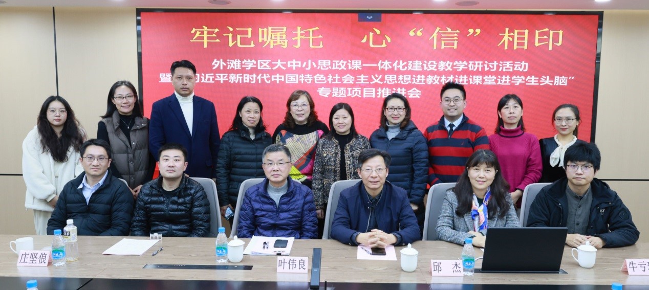为推动大中小思政课一体化建设发展,12月15日,我校马克思主义学院与外滩学区联合举办大中小思政课一体化建设教学研讨活动暨习近平新时代中国特色社会主义思想进教材进课堂进学生头脑专题项目推进会,并签署了“上海应用技术大学马克思主义学院与外滩学区大中小思政课一体化合作共建协议”。马克思主义学院党政班子全体成员、光明中学校长朱晓薇、光明中学党总支书记邬雪洁、教师处主任赵程斌、上海市政治学科特级教师叶伟良、以及外滩学区和马克思主义学院的部分教师代表参加。