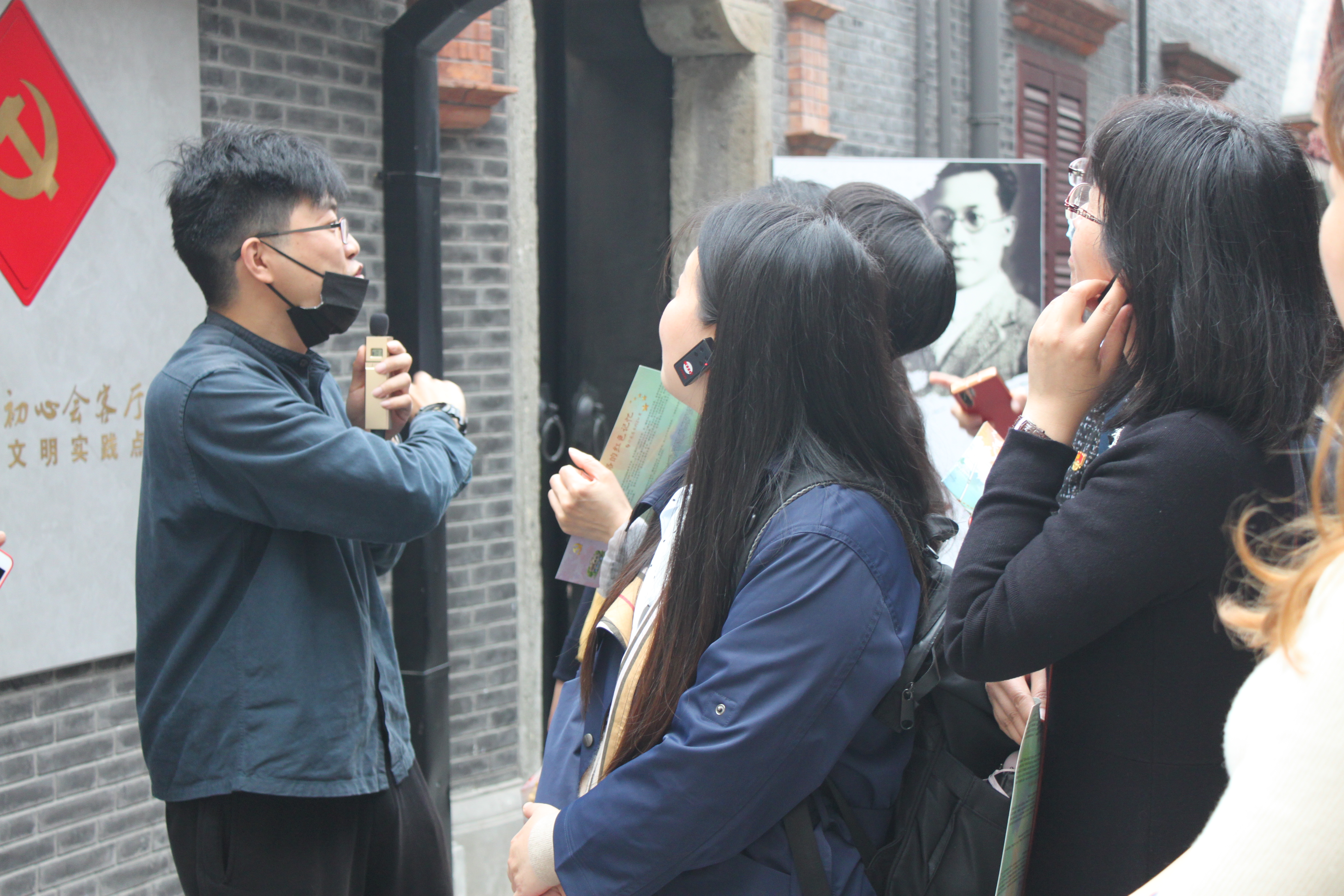 周贇作为此次“行走的课堂”主讲人。党课以“复兴公园”马克思、恩格斯雕塑作为课程的起点,途径“孙中山故居”、“中华职业教育社旧址”、“大同幼稚园”、“国共合作执行部”、“老渔阳里2号《新青年》编辑部旧址”结课。课程围绕中国共产党成立前在上海的革命活动史为基础,让师生身临其境地感受孙中山、陈独秀、黄炎培、毛泽东、毛泽民等一批革命历史人物走过的峥嵘岁月,深刻体会早期共产主义者、民主革命先驱、爱国民主人士在革命和奋斗中的艰难历程。“这种现场体验式的教学,在与历史的对话中,让我们身临其境地体会到,为什么只有这里能诞生中国共产党,为什么必然是中国共产党能带领中华民族走向复兴。”杨蔡豪同学感叹道。