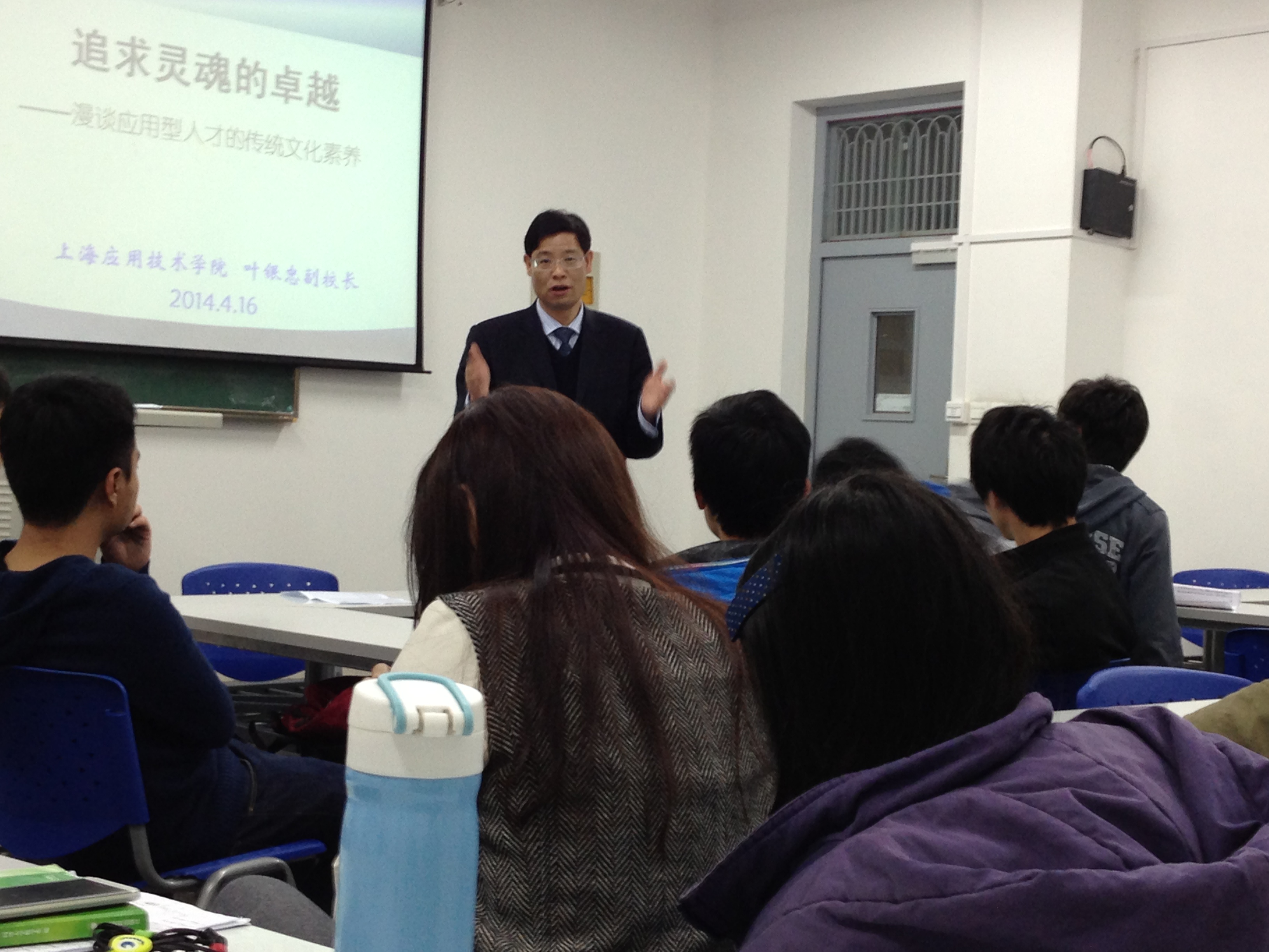 2014年4月16日,“李国娟工作室”邀请到我校副校长叶银忠教授走进课堂,为学生作了题为“追求灵魂的卓越——漫谈应用型人才的传统文化素养”的专题讲座。叶校长从自己为人、为学、为师的亲身经历、我校“明德、明学、明事”校训、应用技术型人才文化素养之养成等角度谈了学习优秀传统文化的重要性。他强调,应用技术型人才不仅要有卓越的专业素养,还应当有卓越的非专业素养,其中优秀传统文化素养就是很重要的一个方面。他希望同学们在校期间,不仅要学好专业课,同时也要拓展视野,博览群书,不断提升自己的文化素养,只有这样才能成长为适应时代和社会发展需要的卓越一线工程师。现场学生就自己的所学、所思、所想与校长进行了深入交流和热烈互动,学生们纷纷表示校长的讲座让他们很受启发,很有收获。