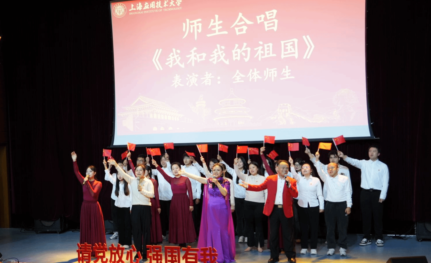 主题艺术党课在马克思主义学院全体师生深情献唱《我和我的祖国》中圆满落下帷幕。马克思主义学院全体师生用最真诚、最浑厚、最有力的声音,表达了对祖国的深沉热爱与美好祝福,展现了新时代的爱国情怀与责任担当。这场主题艺术党课流露出对祖国母亲般的温柔依恋,更传递出愿与祖国同呼吸、共命运,以赤诚之心奉献祖国、共赴复兴的坚定信念。