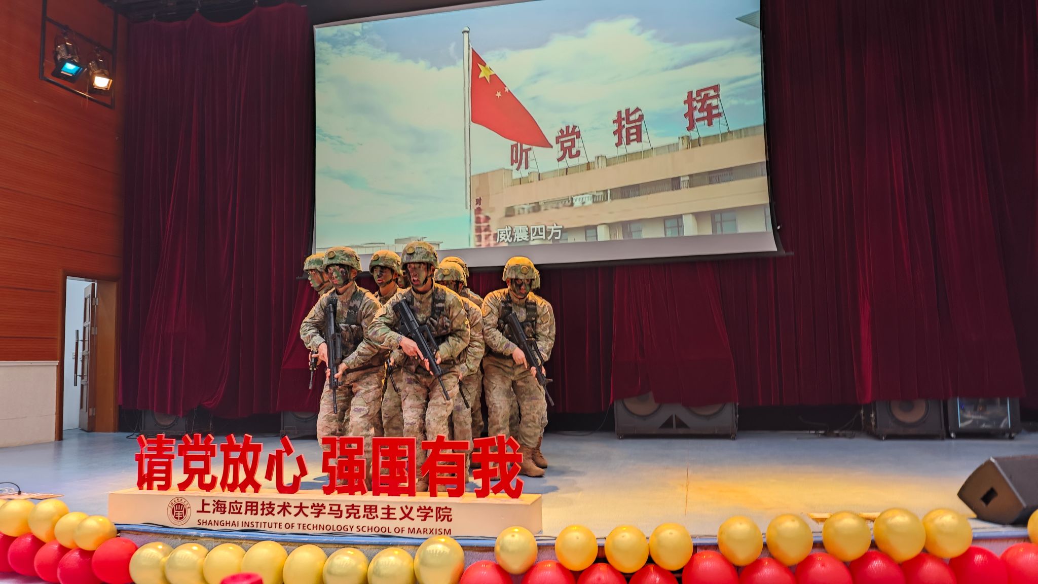 12月8日晚,“铭记历史,展望未来——纪念‘一二·九’运动”主题艺术党课举行,活动由马克思主义学院主办,马克思主义学院团委、研究生会、知行学社承办。校党委副书记、副校长王瑛,党委常委、宣传部部长杨明,空军驻奉某部政治委员吴木杨及其部队官兵,上海成才教育学院、上海开放大学附中成才教学点舞蹈学院任飞校长及其舞蹈团队,上海市群众文艺指导员、马克思主义学院兼职研究生实践导师周国良老师,马克思主义学院领导班子、全体研究生、教师代表与特邀嘉宾出席活动。