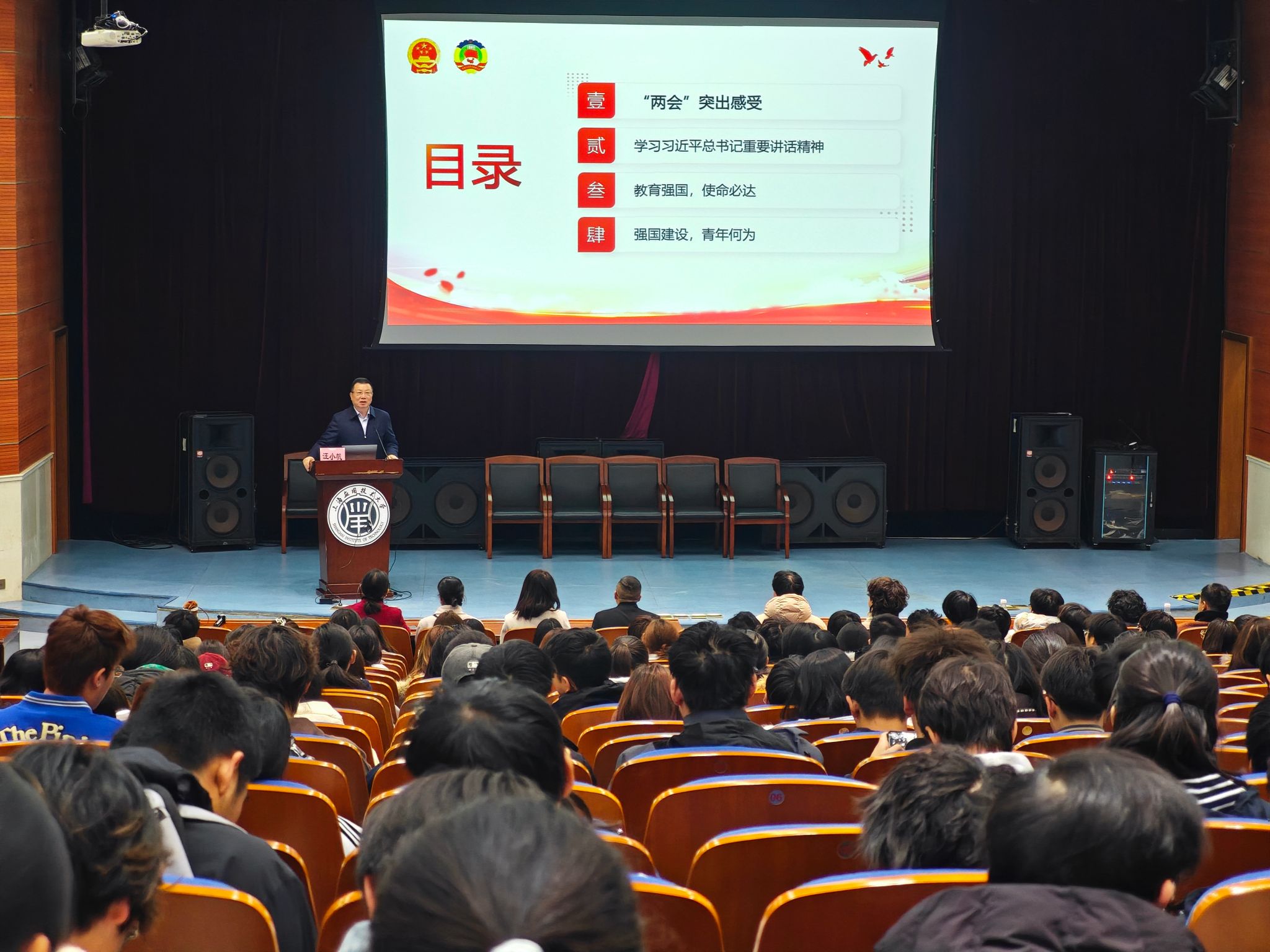 3月25日上午,上海应用技术大学奉贤校区图书馆B106座无虚席、气氛热烈。第十四届全国政协委员、教育部长江学者特聘教授、校长汪小帆以《从“两会”看青年学生的使命担当》为题,为全校本科生、研究生及师生代表带来一场学习贯彻全国两会精神的专题“大思政课”。马克思主义学院院长张向前教授主持,500余名师生代表齐聚一堂,共学两会精神、共话青春使命。