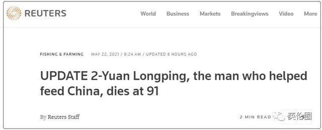 路透社:帮助中国的袁隆平去世,享年91岁