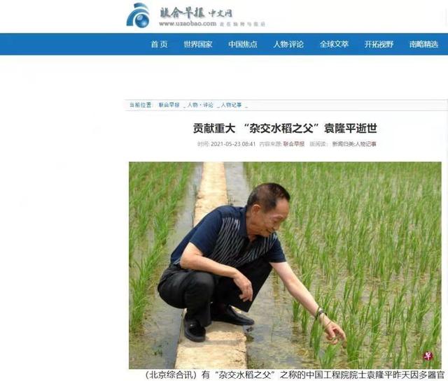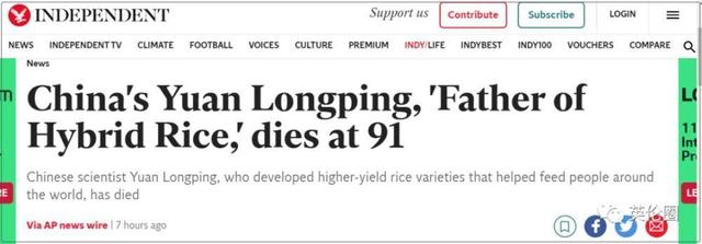 英国独立报:中国“杂交水稻之父”袁隆平去世享年91岁