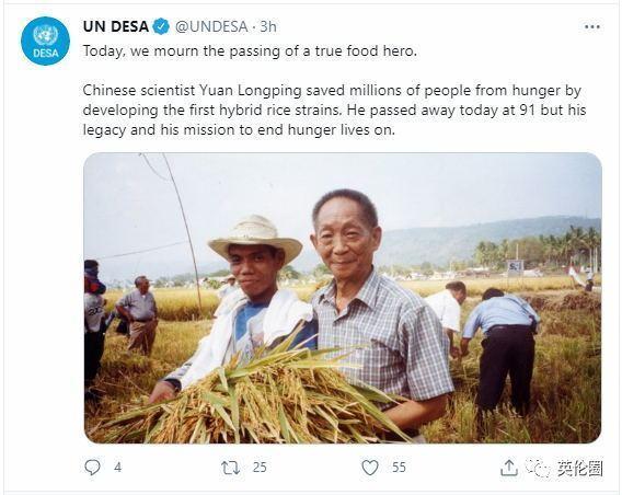 @联合国经济和社会事务部(UNDESA):今天,我们一起悼念这位逝世的食品英雄。中国科学家袁隆平通过研发首个杂交水稻植株,使数百万人免于饥饿。他今天以91岁高龄去世,但他留下的遗产和消除饥饿的使命仍在继续。