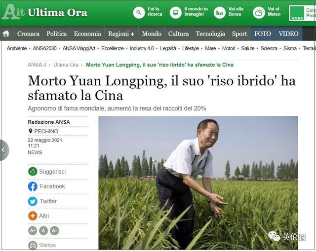 意大利最大通讯社安莎社:袁隆平去世,他的“杂交大米”喂饱了中国