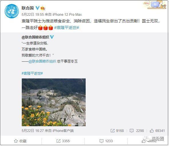 联合国、联合国粮农组织、联合国经济和社会事务部也纷纷发微博、推特悼念袁隆平: