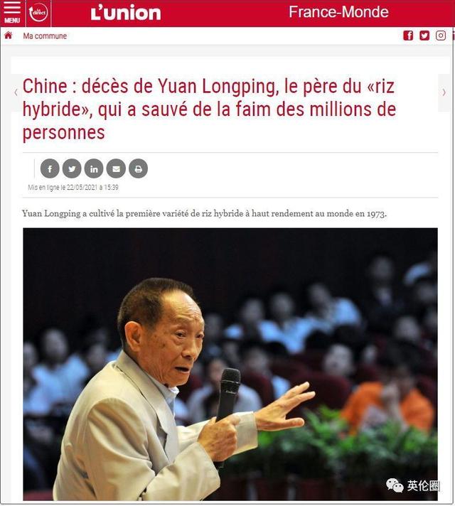 法国地方日报联盟:中国:“杂交水稻”之父袁隆平去世,他使数百万人免于饥饿