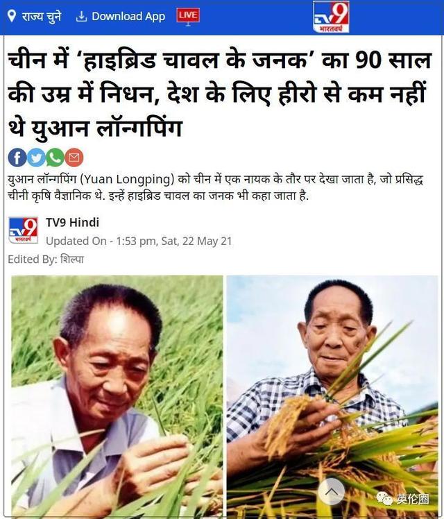 印度媒体《TV9Hindi》:“杂交水稻之父”袁隆平在中国去世,享年90岁,是该国的英雄