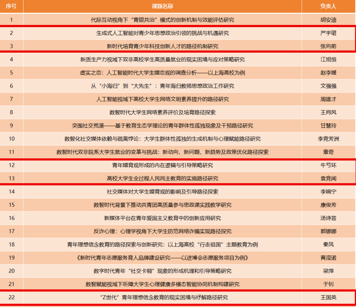 为全面贯彻习近平新时代中国特色社会主义思想,深入学习贯彻党的二十大和二十届二中、三中全会精神,深入学习贯彻全国教育大会精神,认真贯彻落实习近平总书记同团中央新一届领导班子成员集体谈话时的重要讲话精神,加强青少年发展理论和政策研究,进一步整合高校科研力量,提出具有创新性、指导性、实践性的工作机制、模式、方法、对策,并推动研究成果向工作成果转化,团市委开展2025年度上海学校共青团课题研究。马克思主义学院积极组织全院开展课题申报,经过资格审查、专家评审等环节,张向前、严宇珺、牛亏环、袁竞闻、王国英等教师的5项课题成功获得2025年度上海学校共青团课题研究立项,具体情况如下: