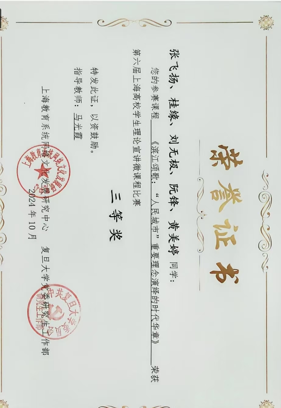 日前,第六届上海高校学生理论宣讲微课程比赛活动结果揭晓,我校由张飞扬、桂缘、刘无极、阮锋、黄美婷五位同学组成的团队凭借出色的表现和深刻的理论理解,在决赛中脱颖而出,荣获三等奖。