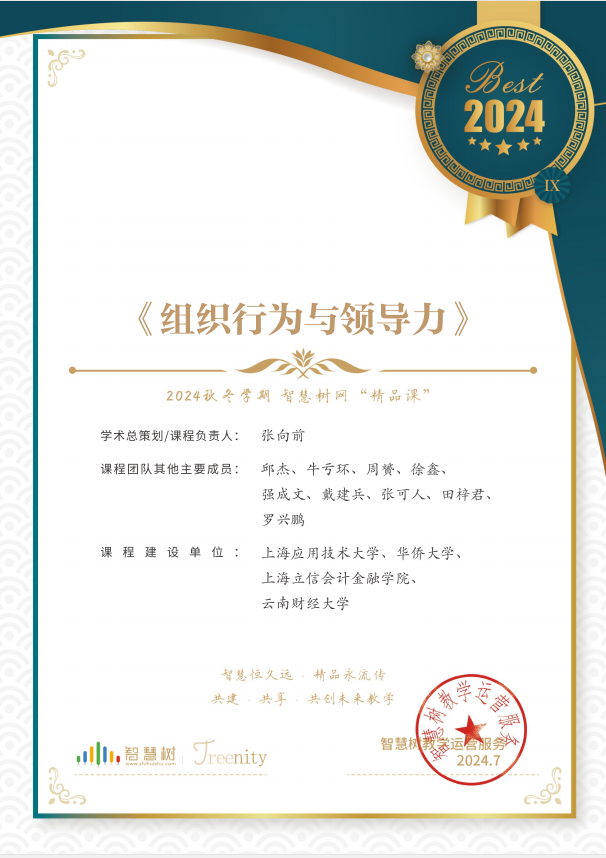 《组织行为与领导力》课程系全国大学生素质教育优秀通选课、国家精品在线课程、首批国家一流在线课程、国家教育部产学协同育人课程改革示范项目,相关线下上海市重点课程。该慕课在国家智慧教育公共服务平台、智慧树、爱课程、超星尔雅、学堂在线等多个学习平台以来,吸引国内外有近1000余所次高校超过20万名学生选课。《组织行为与领导力》慕课目前已在智慧树平台上线运行15学期,617所学校选修,累计选课超13万人次,互动108.01万次,已连续获评智慧树“人气课程”“精品课”“十万金课”等荣誉,同时获评第三届“智慧树杯”全国课程思政示范案例教学大赛一等奖。