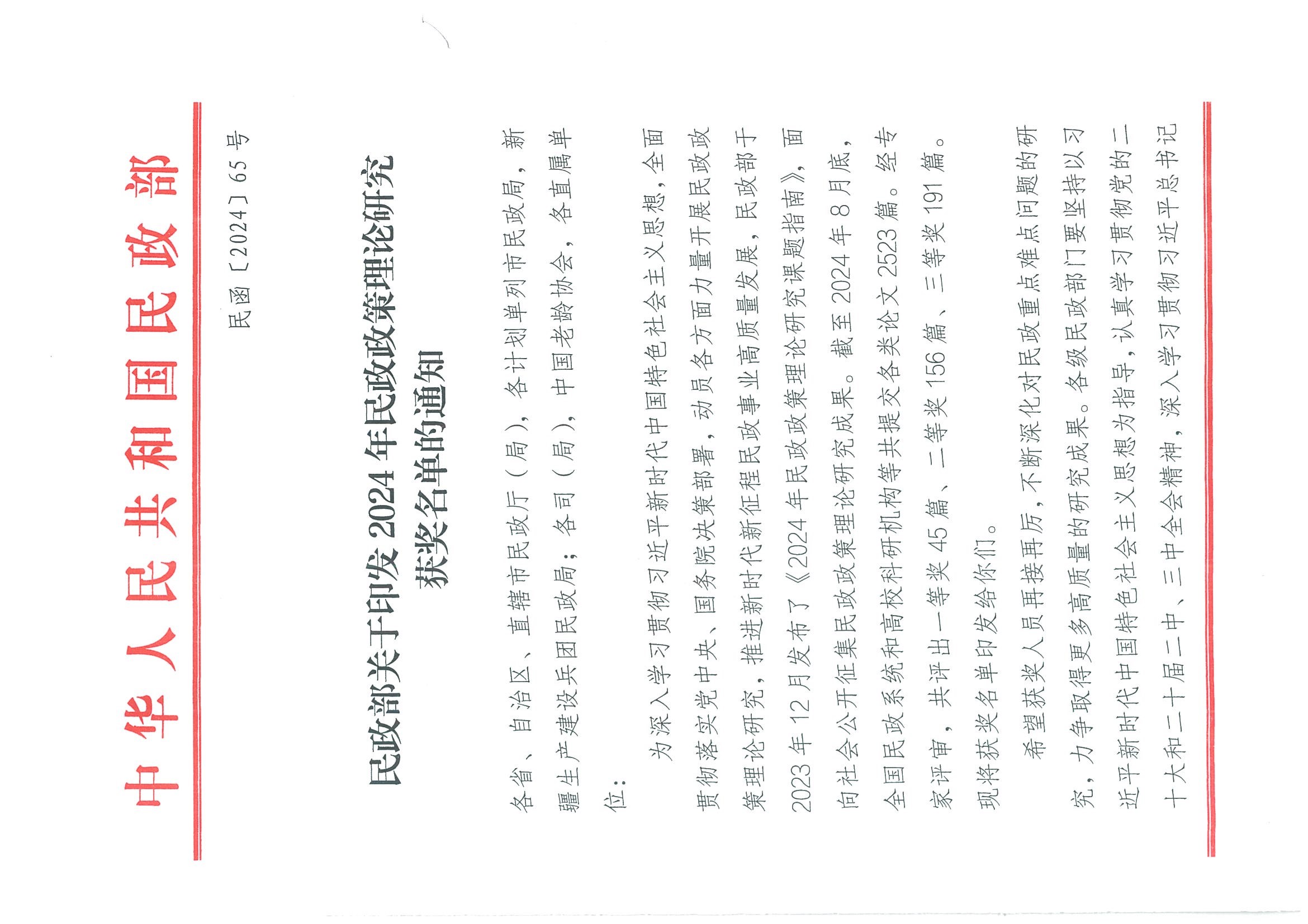 据悉,全国民政政策理论研究成果奖每年评审一次,是国内民政理论研究领域最高奖项,本次评选共收到全国民政系统和高校科研机构提交的各类论文2523篇,经过初审、盲审和会评,评出一等奖45篇、二等奖156篇、三等奖191篇。