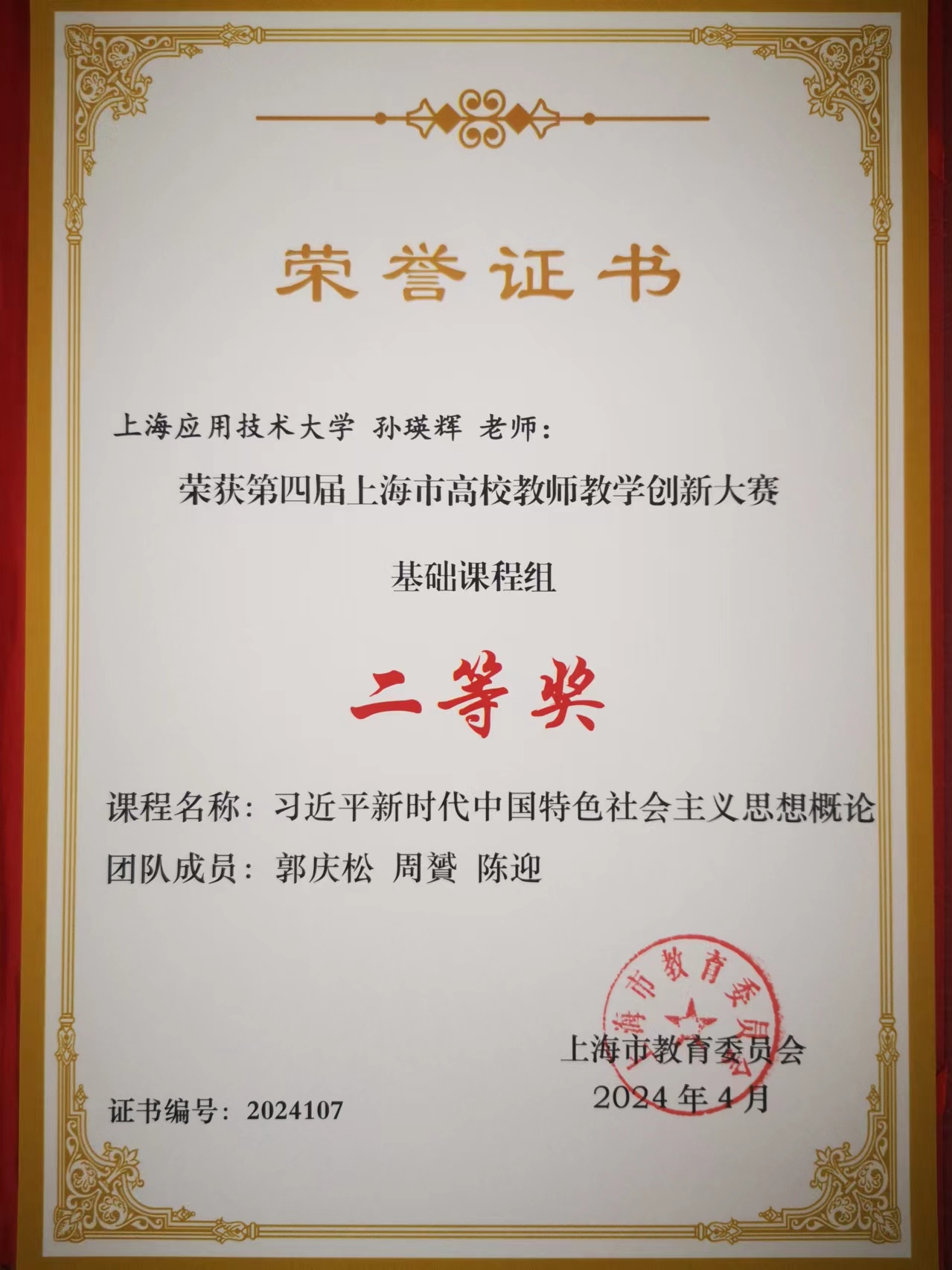 近日,上海市教育委员会公布了第四届上海市高校教师教学创新大赛获奖名单。我院教师孙瑛辉副教授在基础课程组的赛道中经过激烈角逐、勇创佳绩,荣获二等奖。