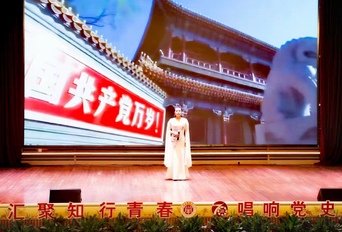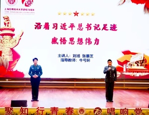 知行学社党史理论宣讲团成员刘旭、张惠芝、张宸杰带来《沿着习近平总书记足迹,感悟思想伟力》等理论宣讲,用自身经历生动讲述了新时代青年大学生的使命与担当。由丁元、周国良、刘燕、魏彪及全体演职人员带来的合唱《领航》,激励广大上应人努力拼搏,为实现中华民族伟大复兴的中国梦奉献力量。