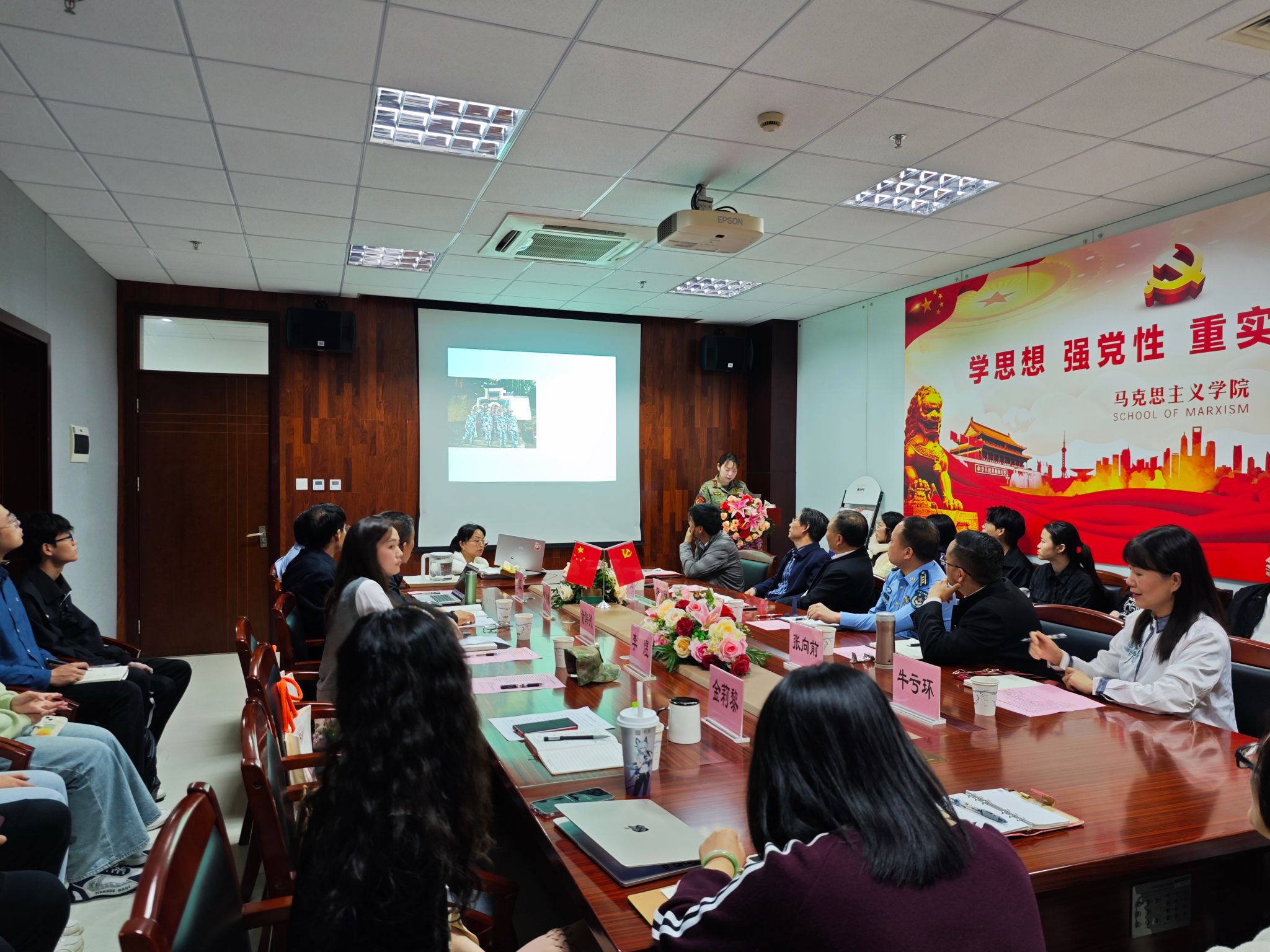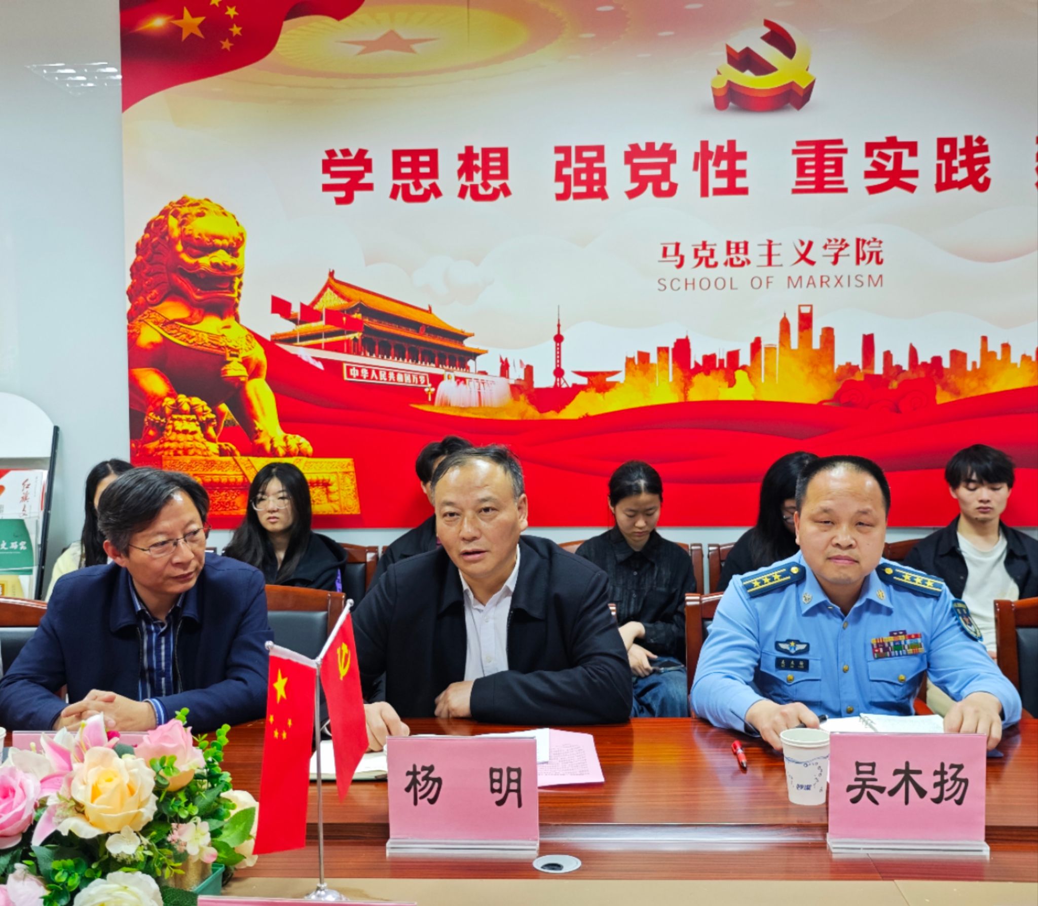 为深入贯彻落实党的二十届三中全会精神,5月9日,我校联合海湾旅游区、上海警备区海湾女子民兵哨所在奉贤校区举行“大思政课”联盟合作共建推进会。本次会议以“凝聚联盟合力,构建‘大思政课’协同育人新格局”为主题,推进国防教育和人工智能专题。校党委常委、宣传部部长杨明,某部队上校政委吴木扬,海湾旅游区团工委书记、党群办宣传工作负责人谢韩沁,海湾旅游区女子民兵哨所哨长李煜,校工会副主席王乐全出席,马克思主义学院党政班子及教师代表、知行学社学生代表、退役大学生代表共同参会。会议由马克思主义学院党总支副书记牛亏环主持。