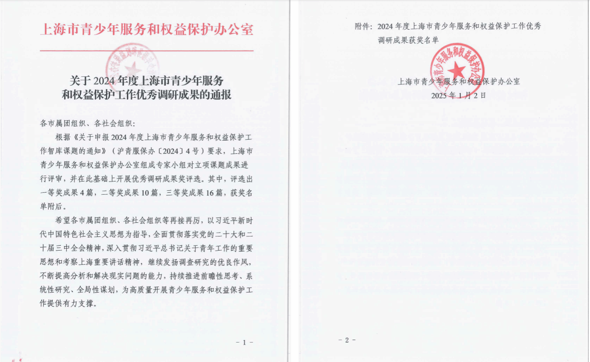 近日,上海市青少年服务和权益保护办公室公布2024年度上海市青少年服务和权益保护工作优秀调研成果获奖名单,上海应用技术大学马克思主义学院张向前团队(张向前、孟雨桐、邱杰、牛亏环、于新东)完成的《新时代青少年社会工作数智化研究》荣获2024年度上海市青少年服务和权益保护工作优秀调研成果二等奖。