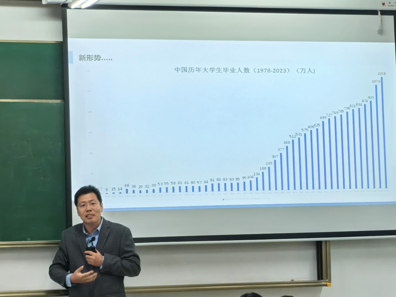 徐鑫博士在讲座中分析了当前中国经济发展的新形势,通过展示2008-2023年全国及上海GDP增长率、中国历年大学生毕业人数(1978-2023)、2002-2024年研究生招生规模等数据,并结合个人职业发展实际案例,鼓励大家在面对职业发展的复杂性和多变性时,要有勇气和智慧去适应变化,把握时代赋予的机遇,实现个人价值和社会价值的和谐统一。他强调,在全球化和技术创新的推动下,职业发展面临着前所未有的挑战和机遇。此外,他还为同学们分享了简历制作的相关技巧,帮助同学们在求职就业中脱颖而出。