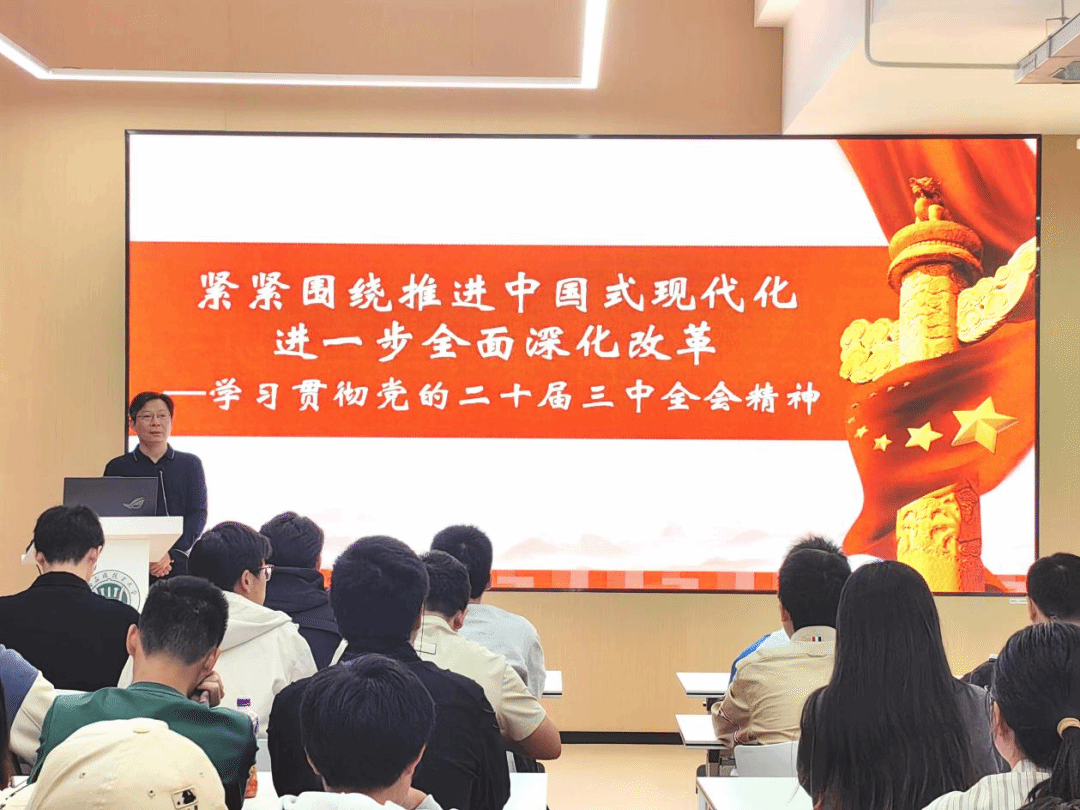 讲坛上,邱杰以扎实的学术功底和丰富的实践经验,深入浅出地介绍了党的二十届三中全会精神的核心要义与深远意义。他从科学社会主义理论出发,阐述了中国式现代化的先进本质和时代价值,让同学们深刻理解了党的二十届三中全会精神对于国家发展、民族复兴的重大意义。通过生动的案例和详实的数据,他从世界经济形势、中国GDP变化、经济发展、人口变化等方面,展示了当前国际国内形势的复杂多变,强调了进一步全面深化改革的重要性和紧迫性。他鼓励同学们要增强“四个意识”、坚定“四个自信”、做到“两个维护”,将个人成长与国家发展紧密结合起来,为实现中华民族伟大复兴的中国梦贡献青春力量。他寄语同学们要珍惜时光,勤奋学习,不断提升自我,用实际行动践行全会精神,为祖国的繁荣富强贡献自己的力量。