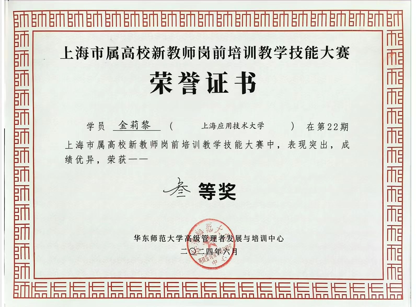 经过大赛组委会评选,上应马院青年教师金莉黎荣获第22期上海市属高校新教师岗前培训教学技能大赛三等奖,金莉黎、刘海辉、岳梅等三位教师在培训班级管理和组织活动中表现突出,分别荣获奉献服务奖、活动组织奖等荣誉。
