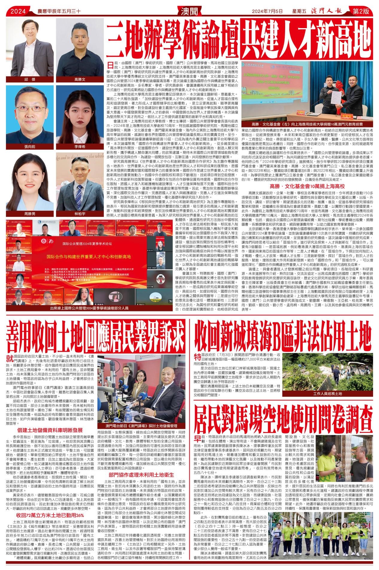 日前,由国际学术研究院、国际公共管理学会、马耳他国立旅游学院、上海应用技术大学主办,上海应用技术大学马克思主义学院、上海应用技术大学—国际学术研究院共建世界重要人才中心和创新高地研究院承办,上海应用技术大学中华优秀传统文化研究院支持,澳门霍英东基金会、高胜•文化基金会资助之国际公共管理2024夏季学术论坛圆满落幕。此次论坛主题为国际合作与构建世界重要人才中心和创新高地,多名专家、学者、研究员参与,会议连续两天采用线上线下相结合方式进行,研究成果将助力国际合作与构建世界重要人才中心和创新高地。