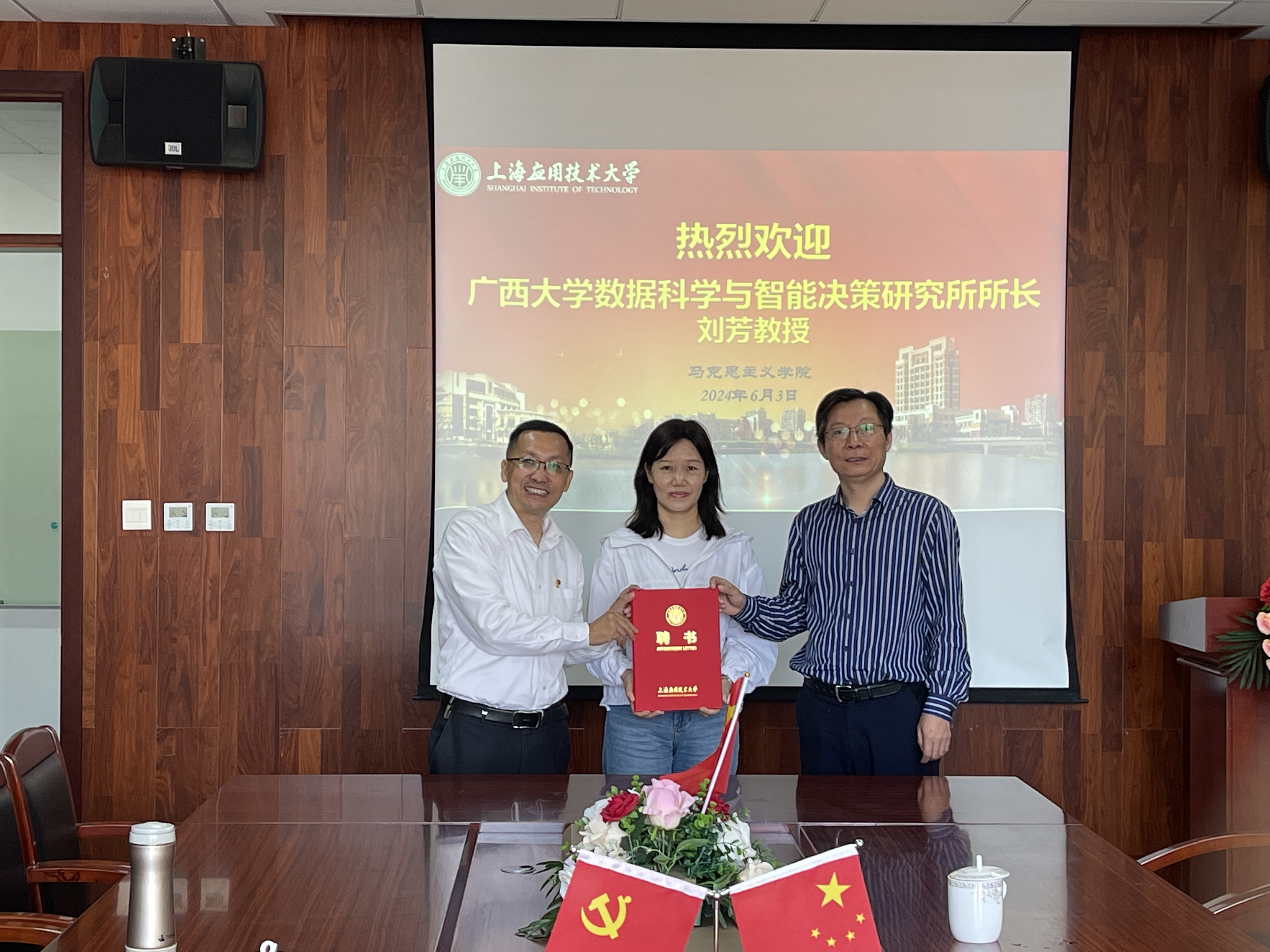 会上,邱杰书记、张向前院长代表马克思主义学院向刘芳教授颁发“上海应用技术大学马克思主义学院客座教授”聘书。