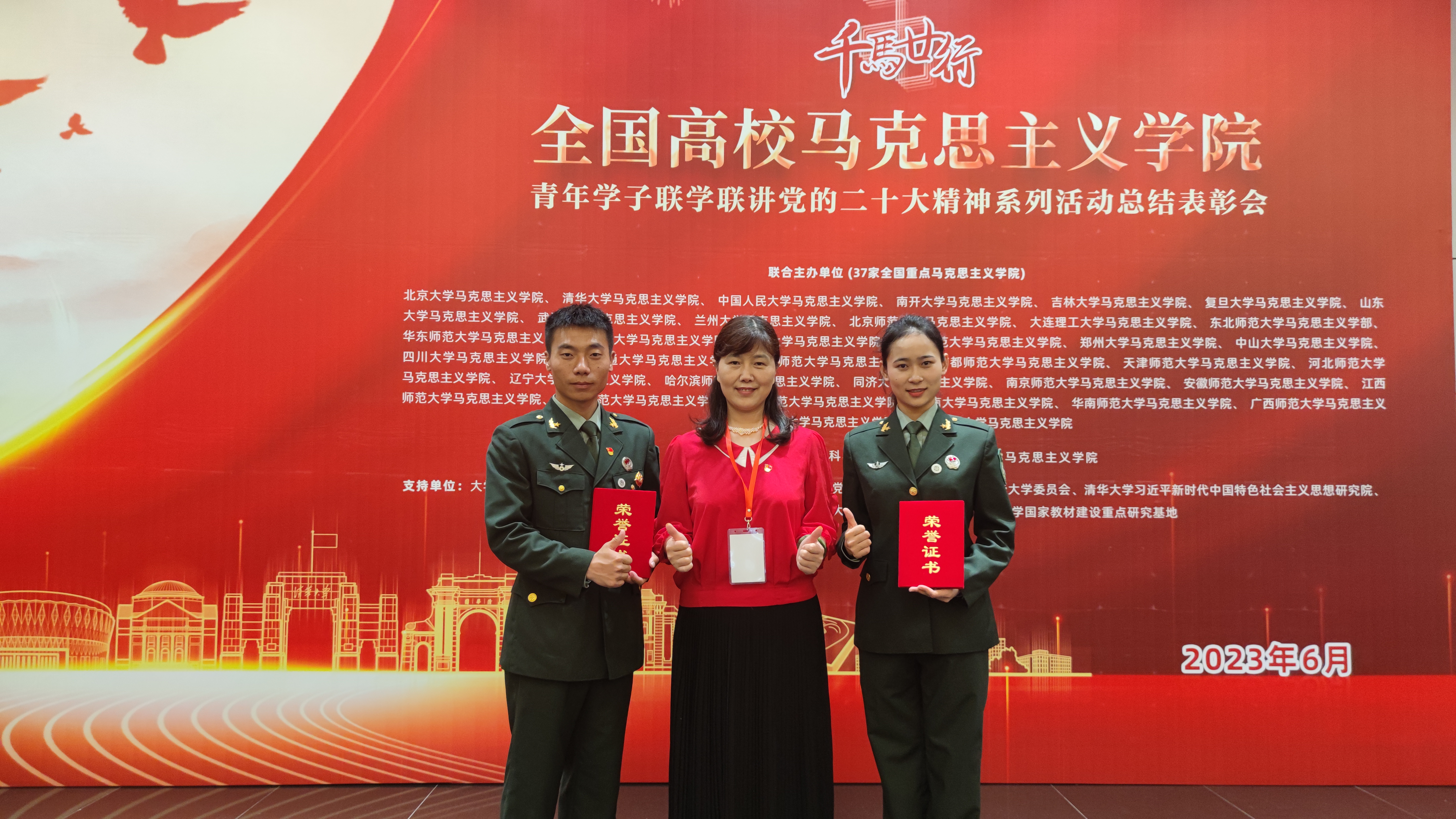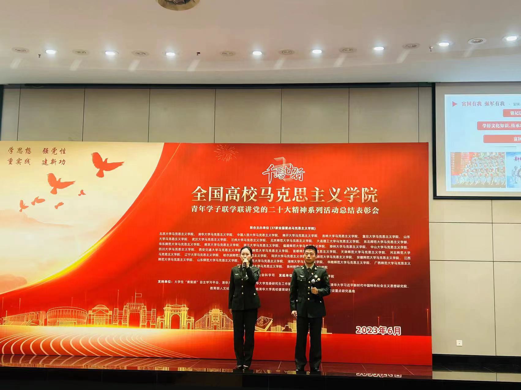 “千马廿行”全国高校马克思主义学院青年学子联学联讲党的二十大精神系列活动,是在教育部社科司指导下,由全国37家高校重点马院联合主办、325所高校马克思主义学院注册承办下举行,覆盖人数达13.8万人次。经专家评委严格评审,我校青年学子在马克思主义学院牛亏环等老师指导下的2项参赛作品喜获佳绩!其中,由孙雅文、张博炜主讲的《以习近平强军思想引领新时代新征程》、赵长宁主讲的《青春颂党恩,闪耀启新程》分别荣获特等奖(全国仅3个)、二等奖(全国仅25个)!