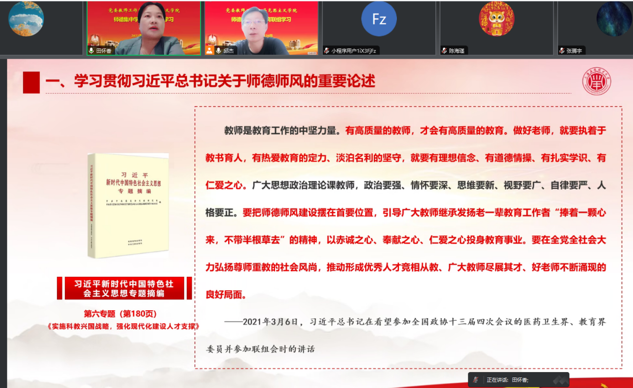 为深入开展学习贯彻习近平新时代中国特色社会主义思想主题教育,不断加强师德师风建设和学习教育,7月20日下午,校党委教师工作部和马克思主义学院通过腾讯会议线上开展师德集中学习教育联组学习会。校党委副书记陈海瑾出席会议并讲话。校党委教师工作部部长、人事处处长田怀香、党委教师工作部副部长彭亚萍、马克思主义学院直属党支部副书记牛亏环、副院长周贇以及党委教师工作部、马克思主义学院全体教职员工参加会议。会议由马克思主义学院直属党支部副书记、常务副院长邱杰主持。
