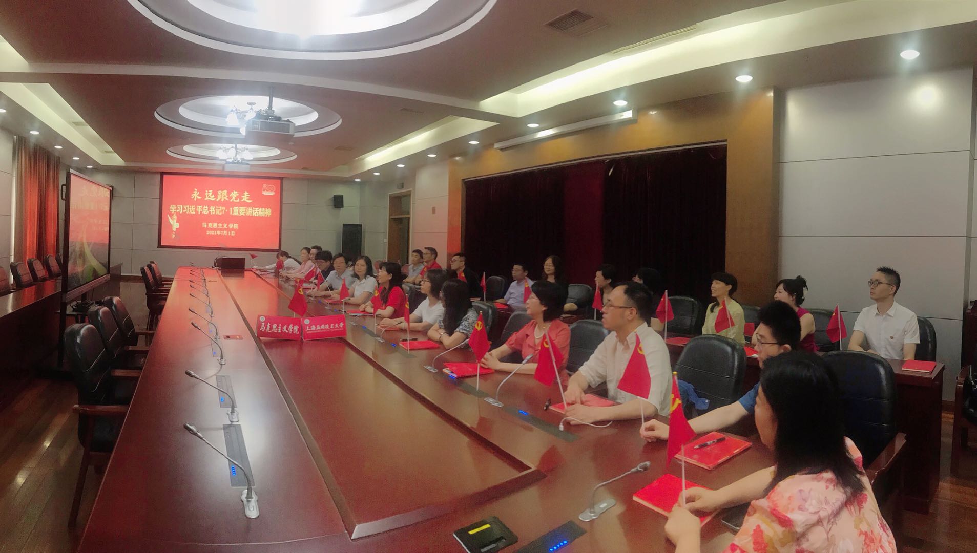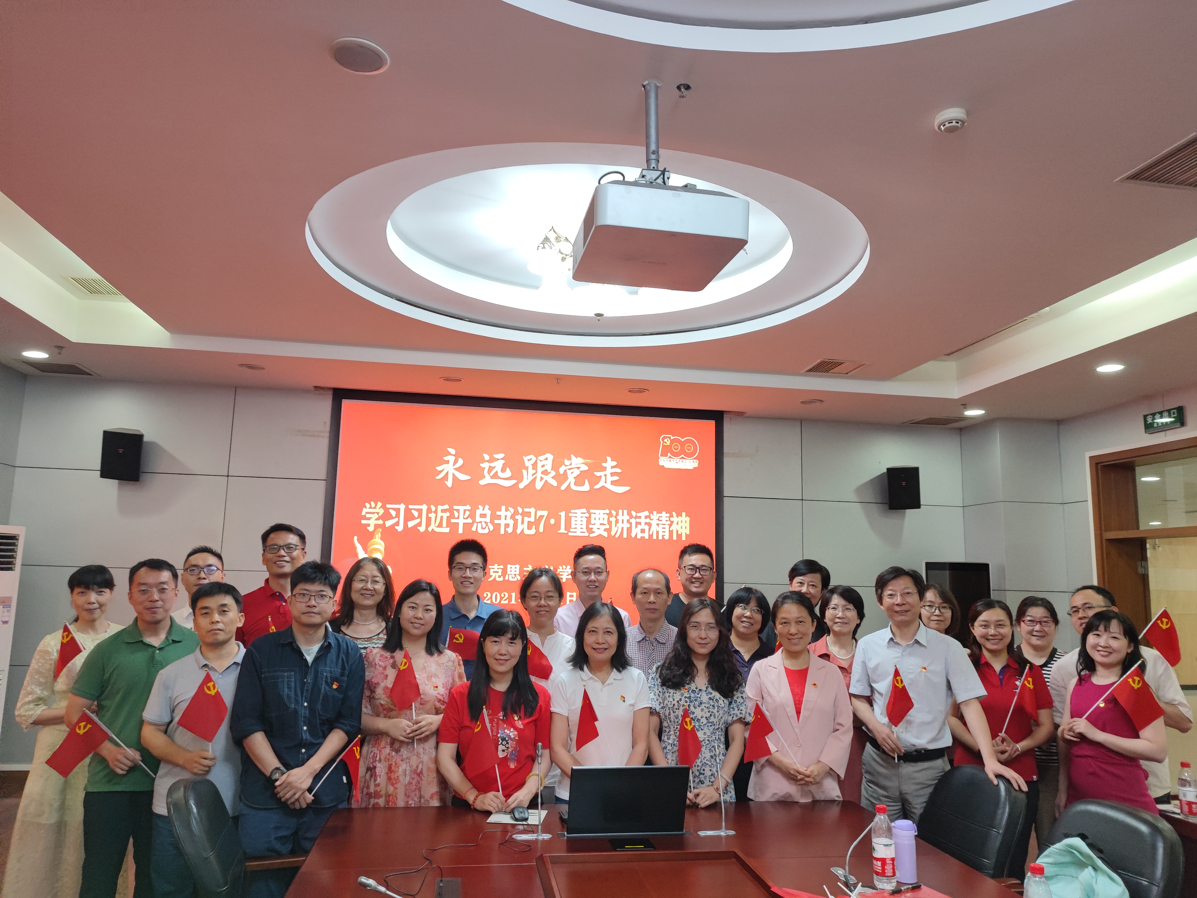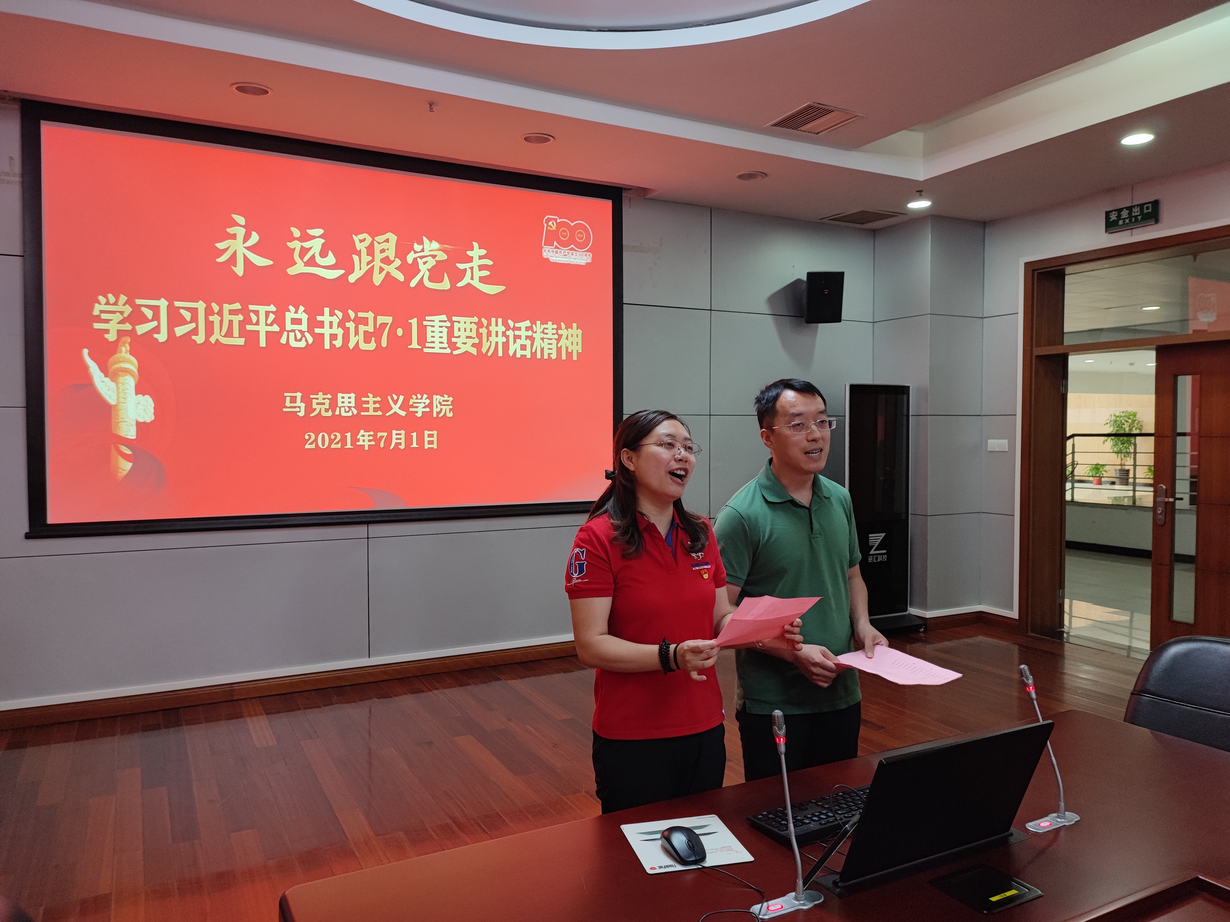 7月1日上午,马克思主义学院在徐汇校区图书馆117会议室集体学习近平总书记在庆祝中国共产党成立100周年大会上的讲话精神。马克思主义学院党政领导班子及教师出席。随后,与会教师通过重温入党誓词仪式、朗诵红色诗歌《党啊,齐爱的妈妈》、合唱红色歌曲《唱支山歌给党听》等丰富多彩的活动,共同庆祝中国共产党成立100周年。