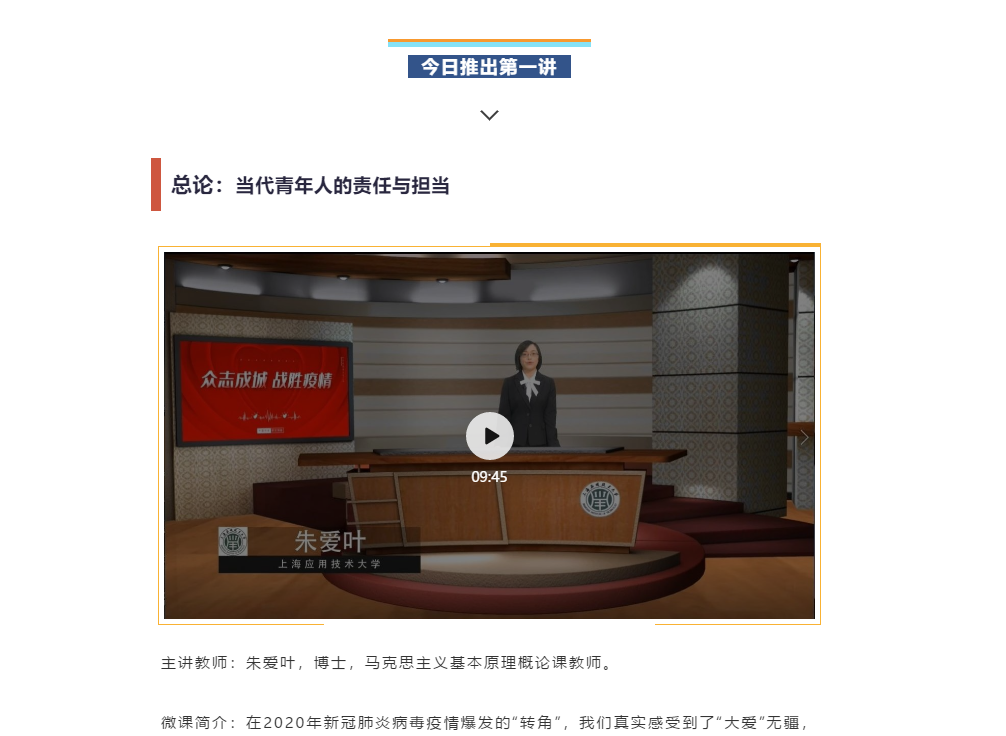 本系列微课涵盖了哲学、法律、历史、党建、道德、国际关系、时事政治等多个角度,切入抗疫一线的方方面面,为大学生剖析本次疫情中的点点滴滴。