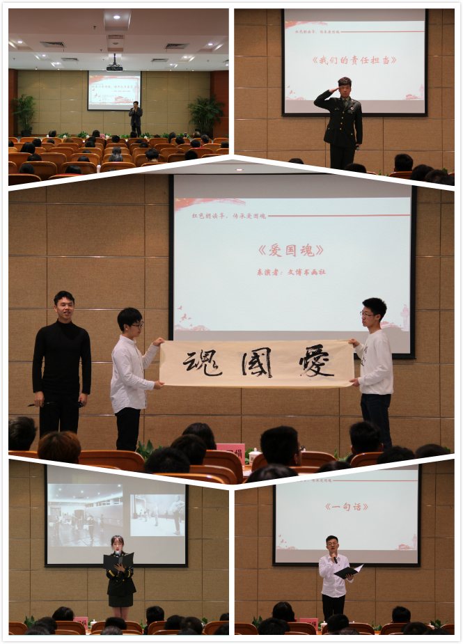 活动分“山河破碎,青年觉醒”、“家国情怀,革命新潮”、“青春热血,时代新观”、“负重前行,共筑国梦”4个篇章进行。活动气氛热烈,文博书画社的《爱国魂》、退伍士兵的《我们的责任担当》和《我们的芳华》将活动推向了高潮。最后,活动在全场《我爱你中国》的歌声中结束。