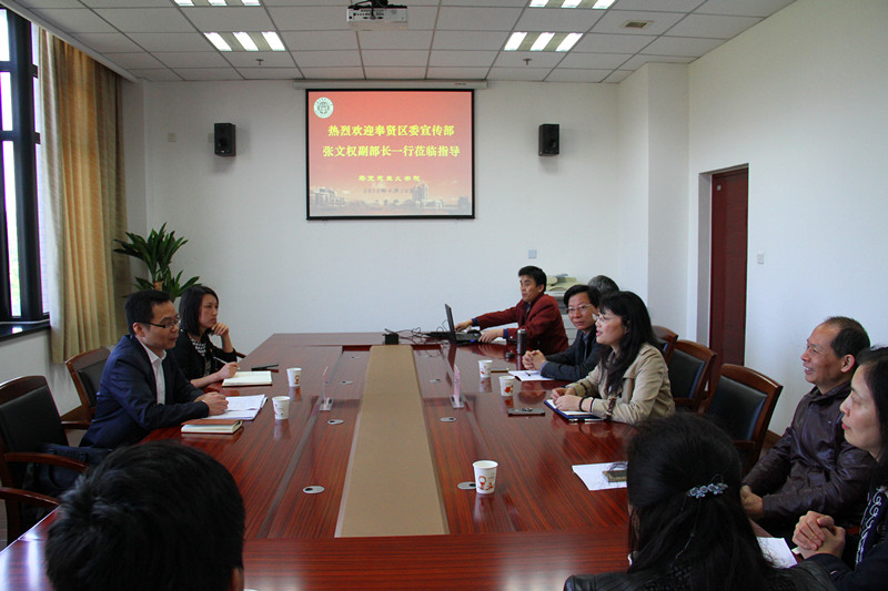 为进一步研究和传播“贤文化”,4月10日上午奉贤区委宣传部副部长张文权一行前来马克思主义学院开展交流活动。马克思主义学院院长李国娟、常务副院长邱杰、副书记杨燕华及从事传统文化研究的教师代表热情接待了张文权一行。