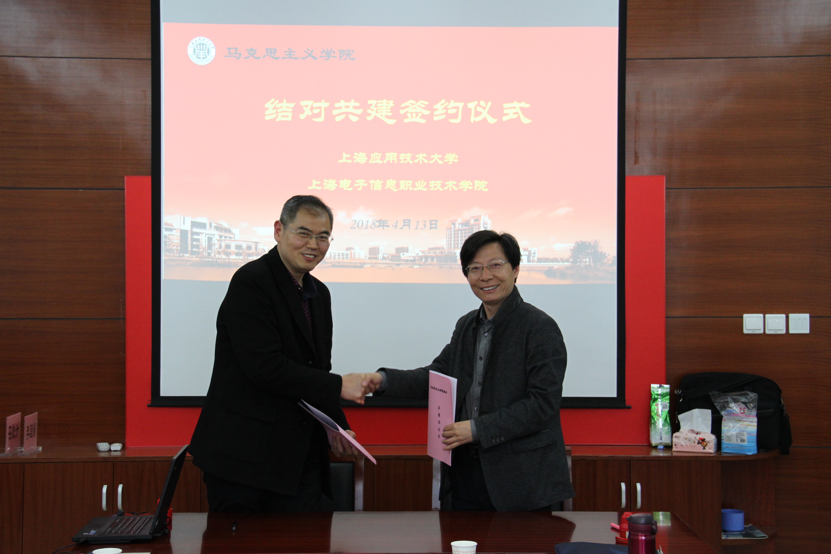 邱杰对茌良计一行表示了热烈欢迎,并介绍了马克思主义学院教学科研、师资队伍建设以及“示范马院”建设的经验和成果,并展望了两院合作的美好愿景。茌良计表示结对共建对两院来说是具有里程碑意义的事情,他希望两院教师能够积极交流教学经验、分享教学成果。之后,邱杰和茌良计代表两院签署了结对共建协议书。