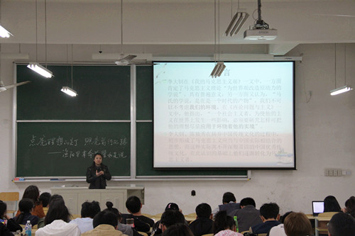 为纪念五四运动98周年,大力弘扬“五四精神”,进一步提升我校青年大学生的思想觉悟,5月4日晚,马克思主义理论宣讲团于二教E101举办了以“点亮理想之灯,坚定前行之路”为主题的宣讲活动。本次宣讲由马克思主义学院周妤教授领衔,马克思主义理论宣讲团指导老师马光霞、黄美菊与宣讲团朱红鹏、刘静、桂宗广三位同学联袂主讲,来自全校各学院100余位同学现场聆听了此次宣讲。