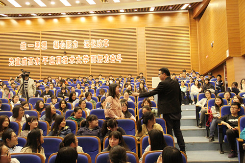 潘前卫以其带有海派滑稽清口特色的讲课方式,结合“富强、民主、文明、和谐;自由、平等、公正、法制;爱国、敬业、诚信、友善”社会主义核心价值观三个层面的价值要求,为在场的每一位同学上了一堂别开生面的人生课。课堂掌声阵阵,笑声不断。