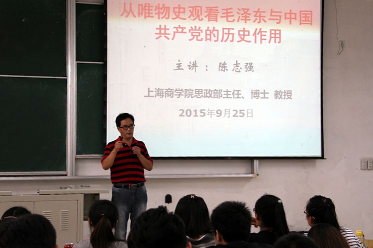 9月25日上午,上海商学院思想政治理论课教研部主任陈志强教授,应邀走进我校《马克思主义基本原理概论》课堂,为同学们专题讲授“从唯物史观看毛泽东与中国共产党的历史作用”。根据辩证唯物主义和历史唯物主义的基本原理,陈教授从哲学和历史的高度对这一主题进行阐述,强调唯物史观从不否认英雄人物在历史上的作用,对于像毛泽东这样的伟大人物,尤其应当采取科学、公正、审慎的态度,实事求是、恰如其分地进行评价。