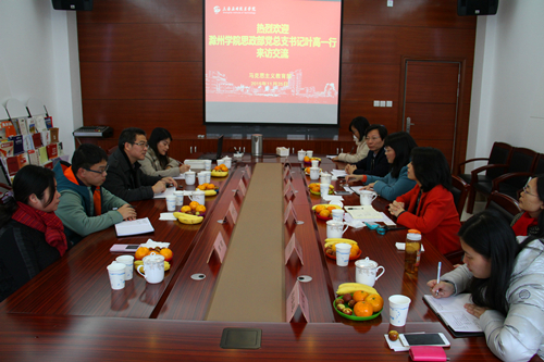 叶高表示非常高兴到访我部,他高度赞扬了我部在思政课教学改革工作中所取得的成果,并介绍了滁州学院思政部的基本情况,以及贵校当前卓有成效的以理论教学、网络教学和实践教学“三位一体”的教学经验,希望在未来能够加强两部之间的互访交流和学习。